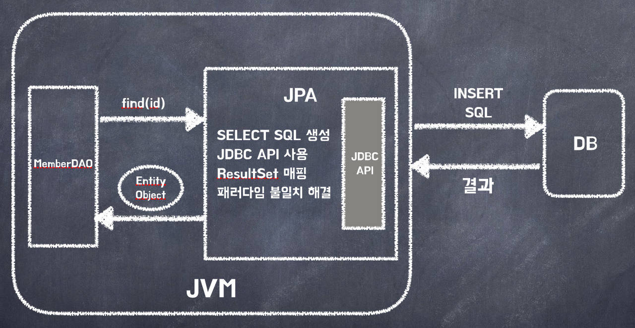 위와 같은 구조들이 더 복잡해진다고 해도 JPA는 이를 모두 지원해주기 때문에 문제없이 사용할 수 있다. 위에서 다룬 JPA의 저장 및 조회는 아래와 같은 구조로 실행된다.